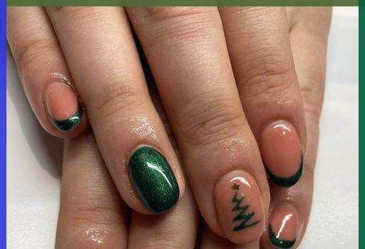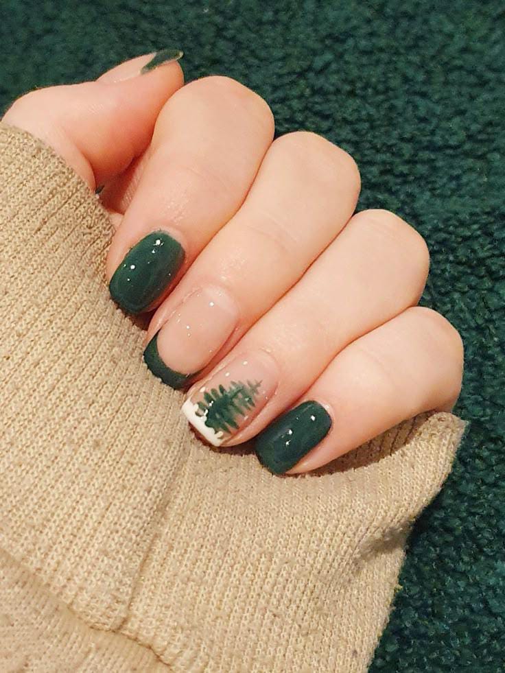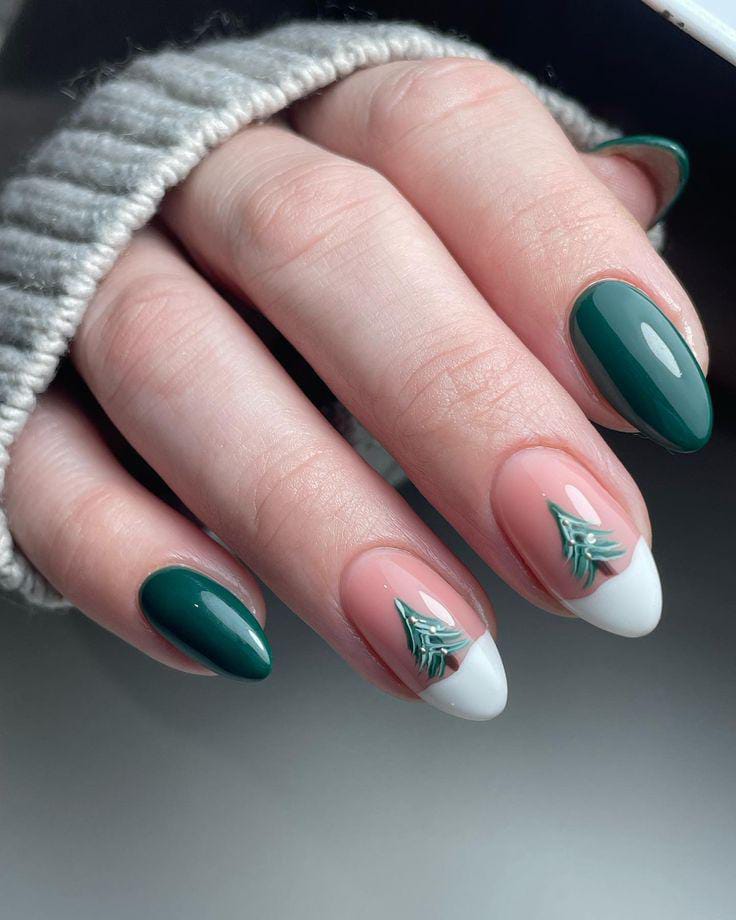 Glossy forest green and nude nails with Christmas tree accents and snowy white tips capture a cozy winter feel with a modern, frosted twist.