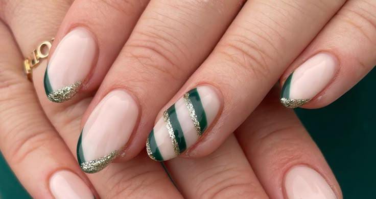 Soft nude nails are styled with diagonal green and gold French tips and striped accent nail, offering a minimal yet festive design perfect for a polished Christmas look.