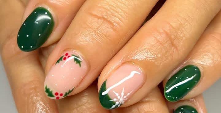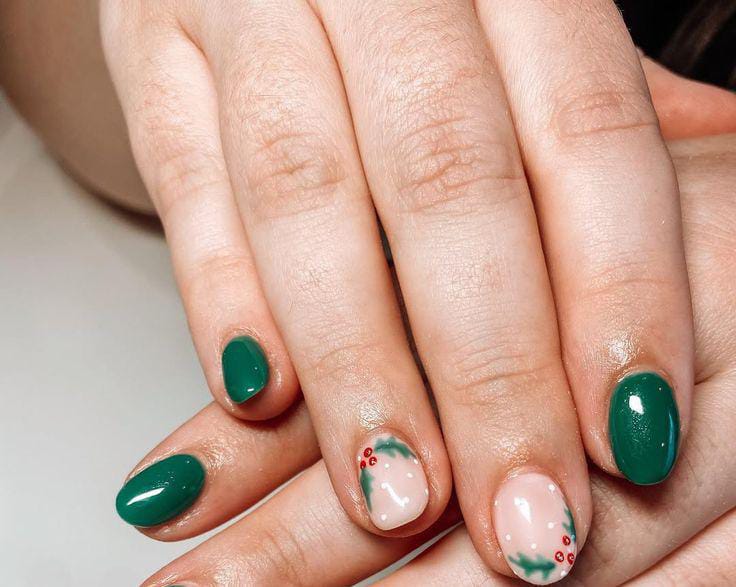 A soft nude base paired with deep green polish and tiny holly accents creates a fresh, festive look that feels classic yet simple Christmas.