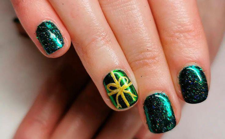 Rich green tones meet gold sparkle and a fine golden bow, creating a cozy Christmas gift-inspired manicure that’s simple, elegant, and full of holiday charm.