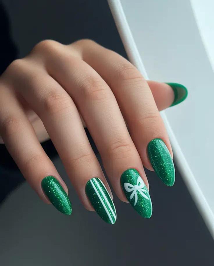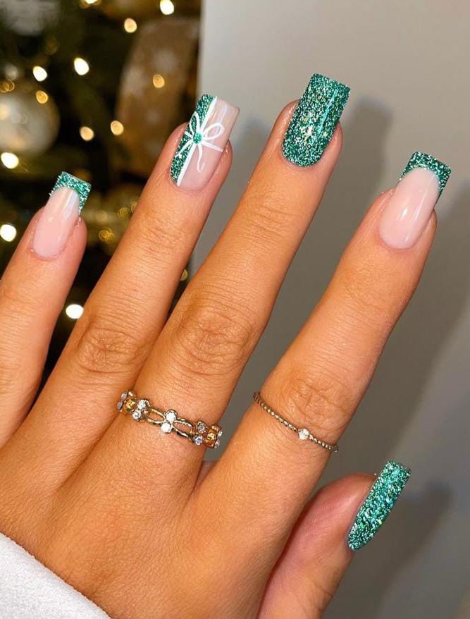 Bright green glitter nails mixed with nude tones and ribbon-like bow details give a playful, wrapped-present charm that’s perfect for Christmas.