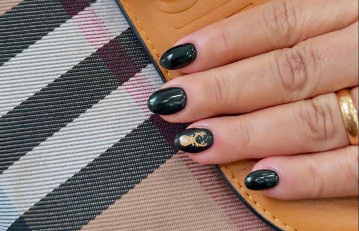 These glossy dark green nails bring a sophisticated Christmas holiday feel, highlighted by a single accent nail featuring a delicate golden reindeer design — simple yet perfectly festive.