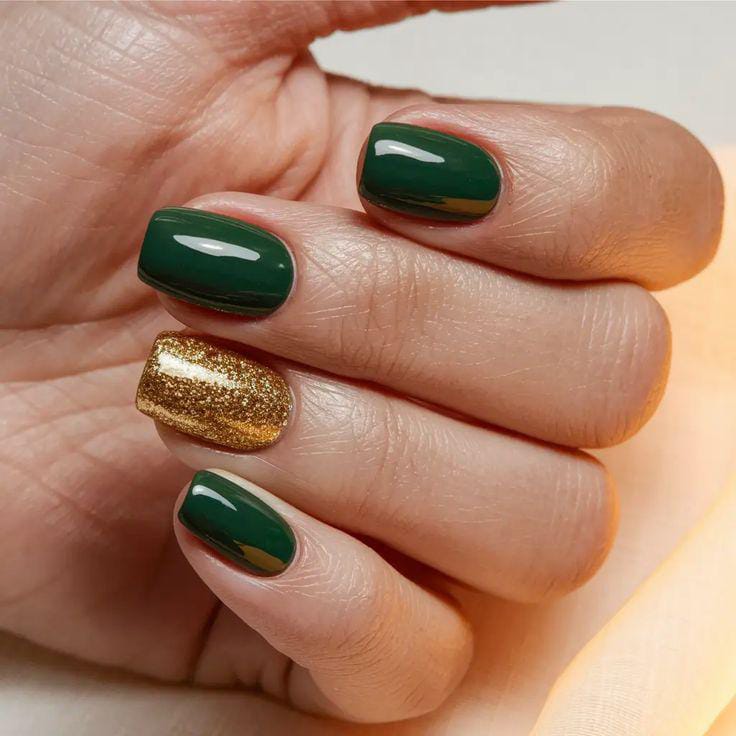 This chic design features rich emerald green nails paired with a single gold glitter accent, giving a touch of Christmas festive sparkle while staying elegant and simple.