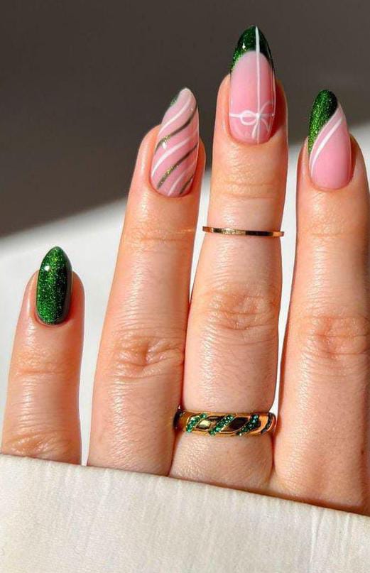 A playful mix of glittery green and pink nails with delicate white ribbon swirls — a perfect balance of soft and festive for the Christmas holiday season.