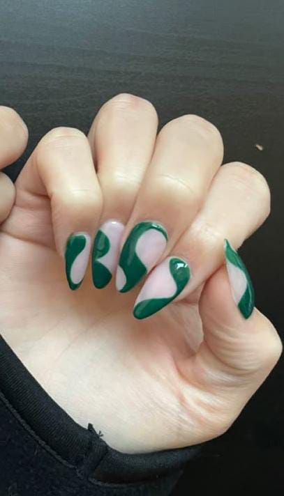 With bold green swirls over a nude base, this abstract design brings a trendy twist to classic Christmas colors in a fresh, modern way.