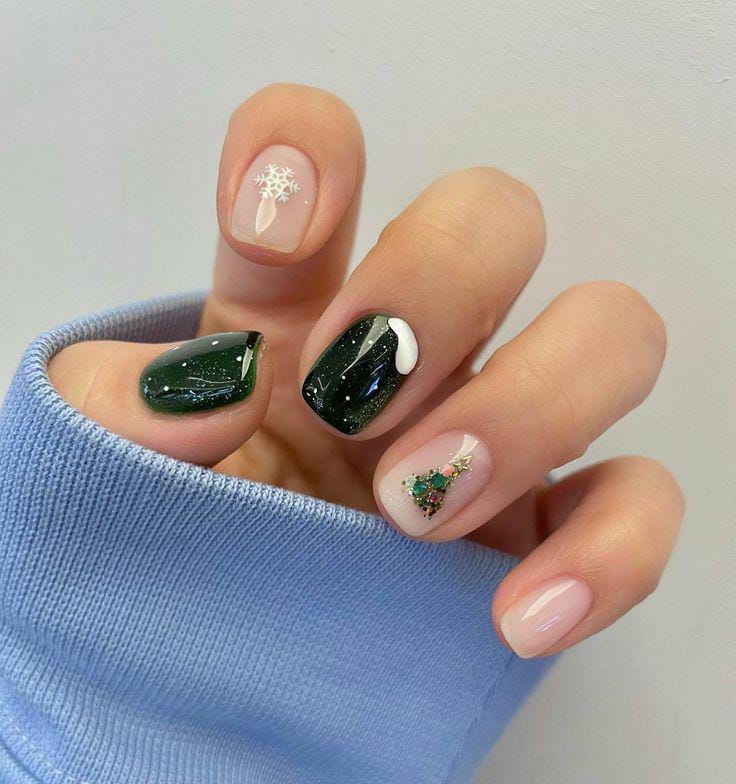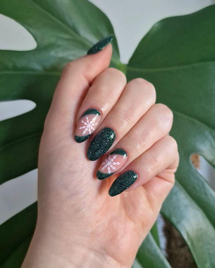 Deep green glitter nails paired with soft nude and green accents and delicate white snowflakes create a wintry, elegant christmas vibe that’s both festive and refined.