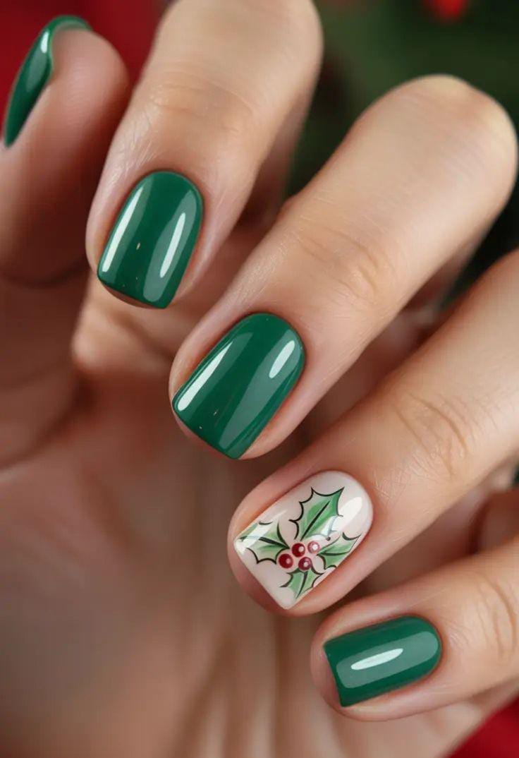 Glossy green nails are brightened up with a single accent nail featuring hand-painted holly leaves and red berries for a touch of Christmas cheer.