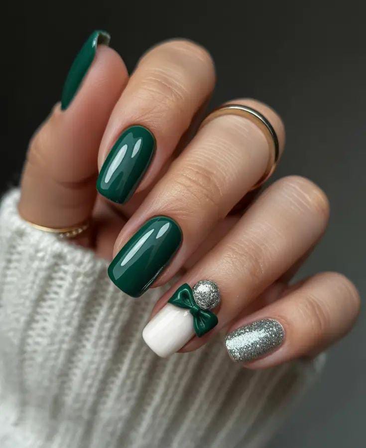 A sleek mix of forest green, silver glitter, and a white accent nail topped with a 3D green bow gives this look a playful, gift-inspired Christmas finish.