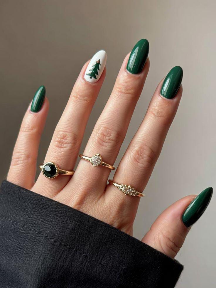 Glossy dark green nails steal the show, with one white accent nail featuring a tiny Christmas tree that adds a minimalist yet festive touch.