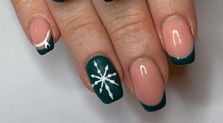 Soft nude nails meet green French tips, highlighted by a white snowflake and curved accents — a simple and cozy winter Christmas look.