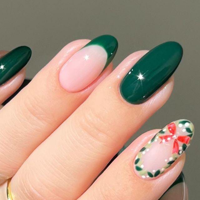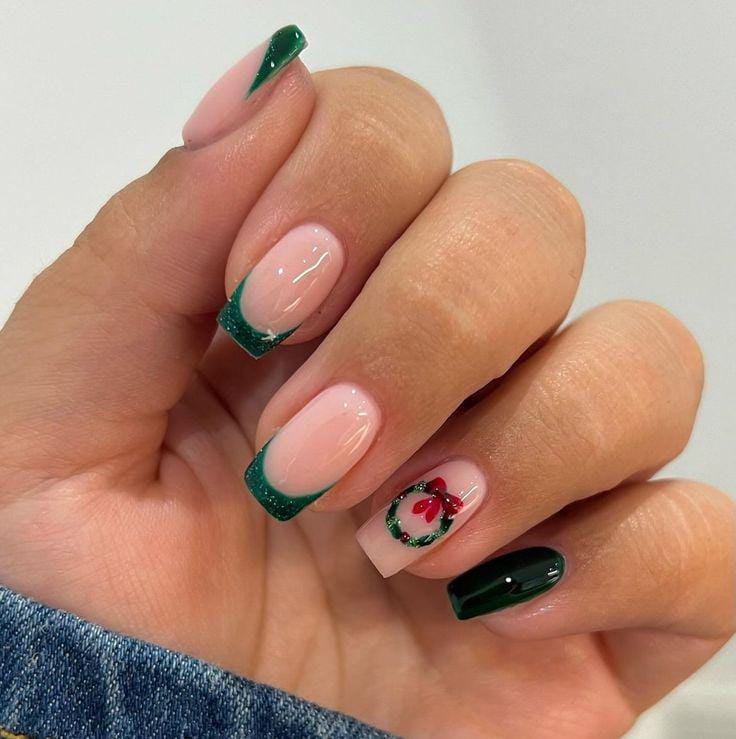 A classy mix of deep forest green and soft nude pink, featuring a glossy French tip twist and a festive wreath accent with a tiny red bow — simple yet full of Christmas holiday spirit.