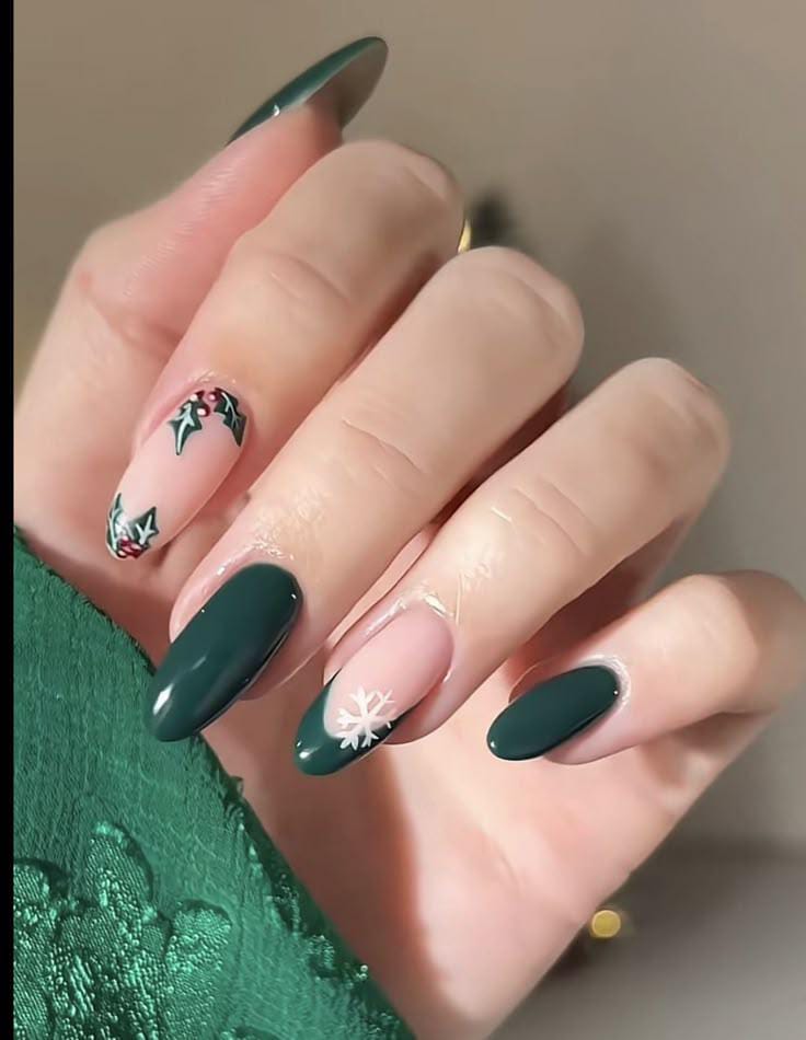 Deep green nails paired with soft nude bases decorated with delicate holly leaves and a white snowflake — a festive yet elegant look perfect for winter, Christmas celebrations.