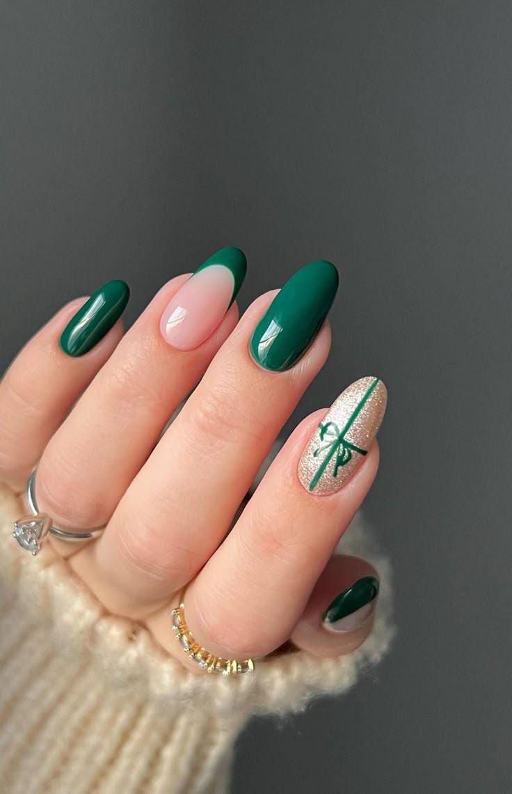 Rich emerald nails mixed with a nude and gold glitter accent nail featuring a cute green bow, capturing the cozy spirit of Christmas presents in a refined way.