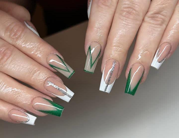 This modern design combines sharp green and white geometric tips with hints of silver glitter, creating a sleek and Christmas festive winter look.