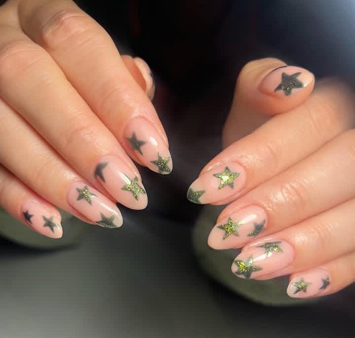 Soft nude nails sprinkled with glittery green stars give a playful, magical Christmas night vibe.