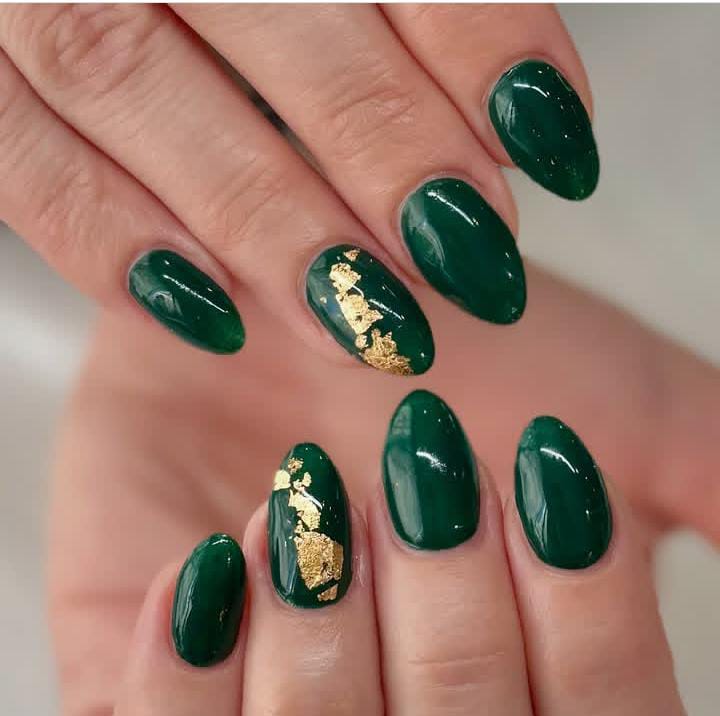 A luxurious dark green manicure elevated by scattered gold foil, adding a touch of warmth and sparkle perfect for the holiday and Christmas season.