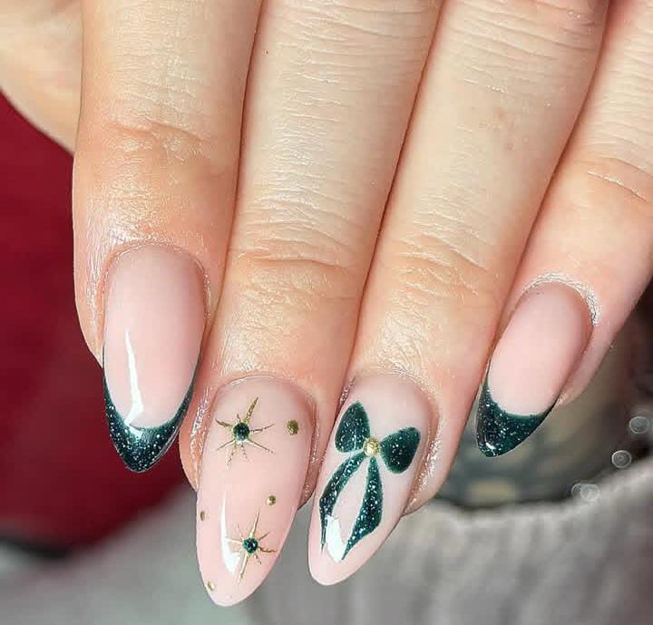 A chic almond-shaped design with glossy nude bases, deep green glitter tips, and delicate gold accents — finished with a cute green bow detail for a festive yet classy Christmas touch.