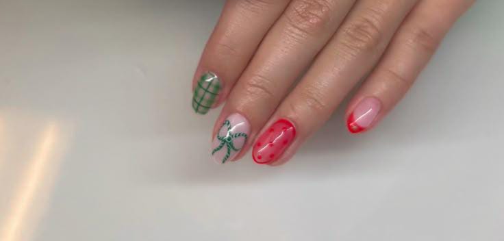 Soft nude nails accented with green plaid, red tips, and a dainty ribbon design create a charming, gift-inspired Christmas look.