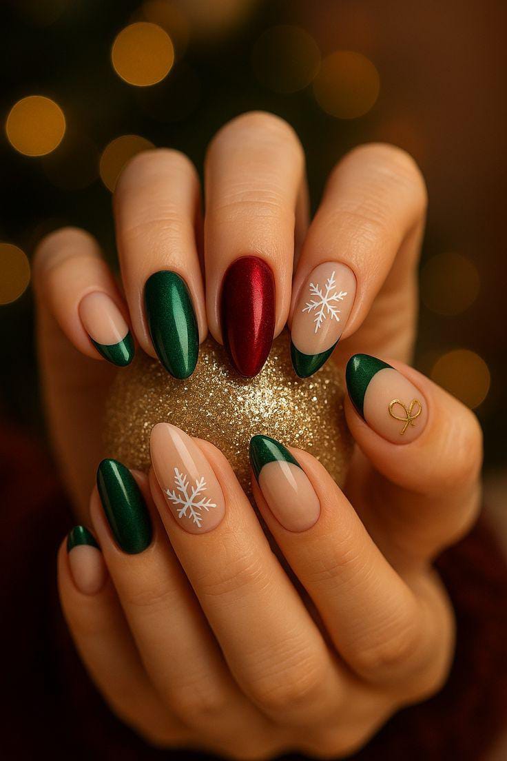 This look combines deep green and shimmering red nails with french tips, decorated with delicate white snowflakes and a tiny golden bow, giving a festive yet classy Christmas winter vibe.