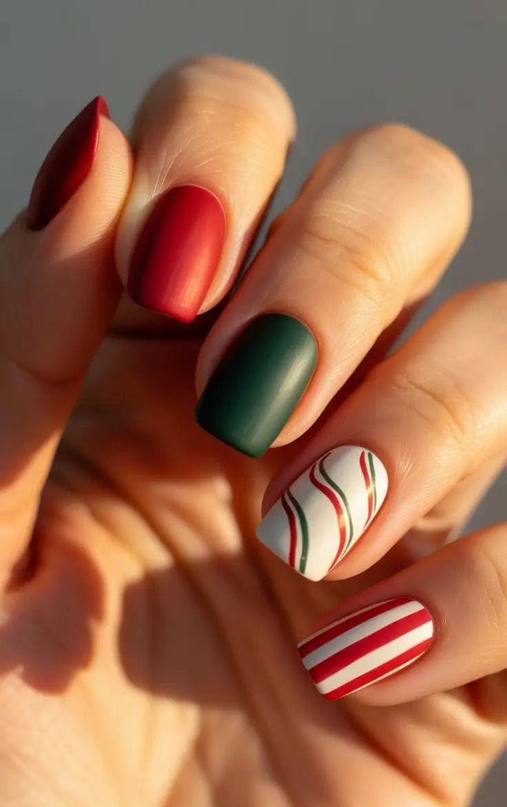 Matte red and green nails mix with crisp white stripes and swirls, inspired by candy canes for a playful, modern twist on classic Christmas colors.