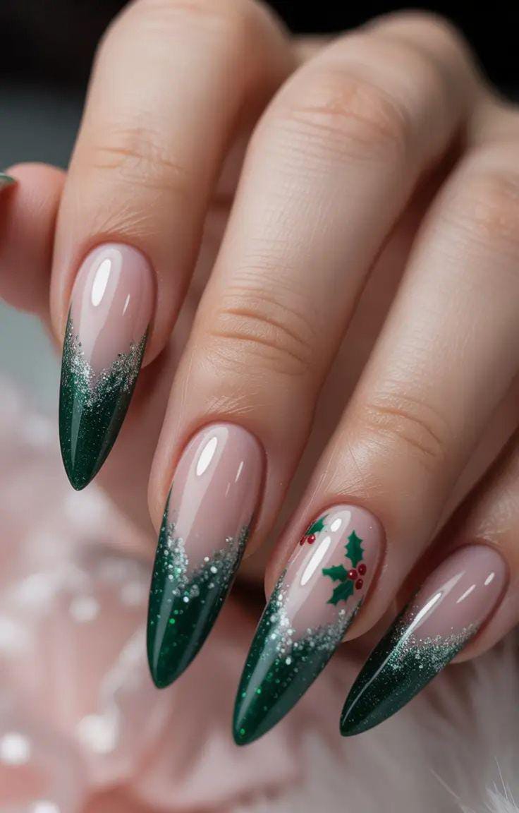 Glossy dark green ombré tips fade into a nude base, highlighted with subtle glitter and tiny holly berry accents for a Christmas magical, wintry forest feel.