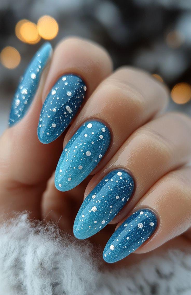 A sheer natural base transitions into blue-silver glitter tips, finished with delicate white snowflakes and dots. It’s a light, frosty design that feels playful and perfect for early-winter January days.