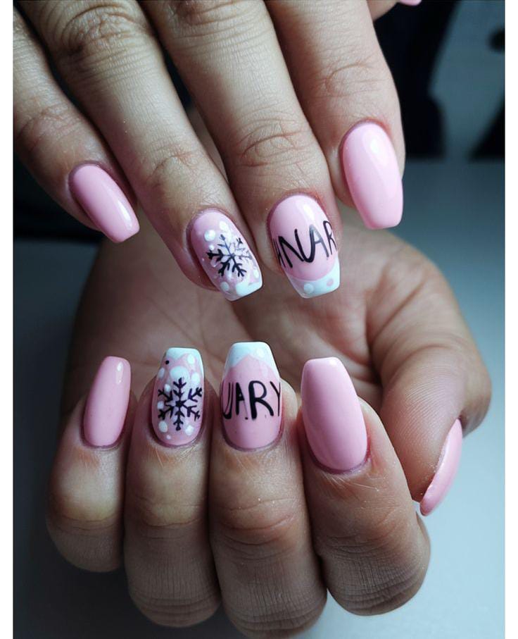 These light-pink nails feature playful snowflakes and “January” lettering, giving the design a fun, themed vibe without feeling too busy. The soft color palette keeps everything simple, seasonal, and cheerful.