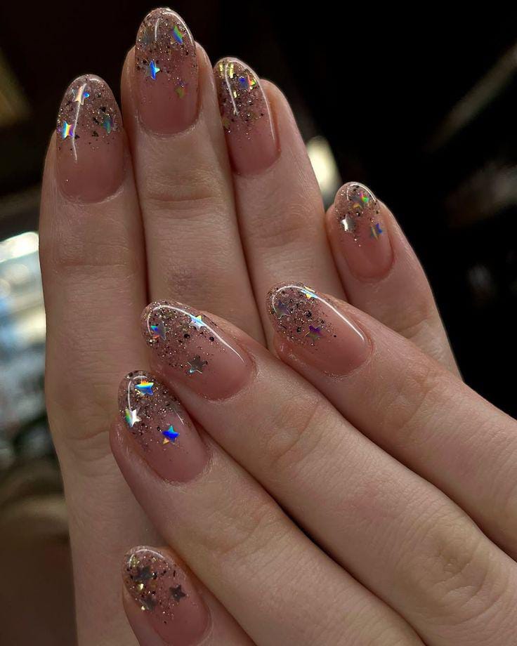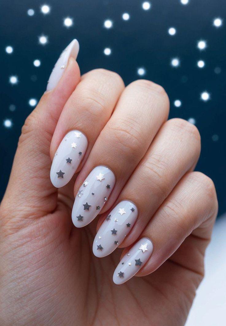 A nude base topped with scattered glitter and tiny holographic stars creates a dreamy, frosted-tip effect. It’s a simple yet dazzling look that feels perfect for the quiet sparkle of early January.