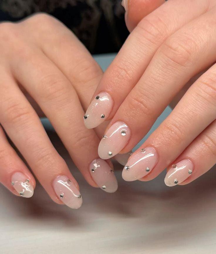This look features soft, milky-pink nails topped with tiny silver studs, creating a clean and minimalist winter sparkle. It feels fresh, simple, and perfect for a subtle January shine.