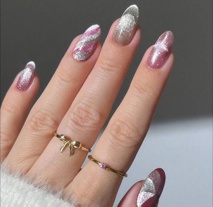 This set mixes pink, silver, and glittery swirls for a fun yet still simple January look with a touch of shimmer. The metallic finish adds brightness without feeling too bold.