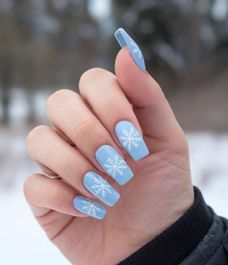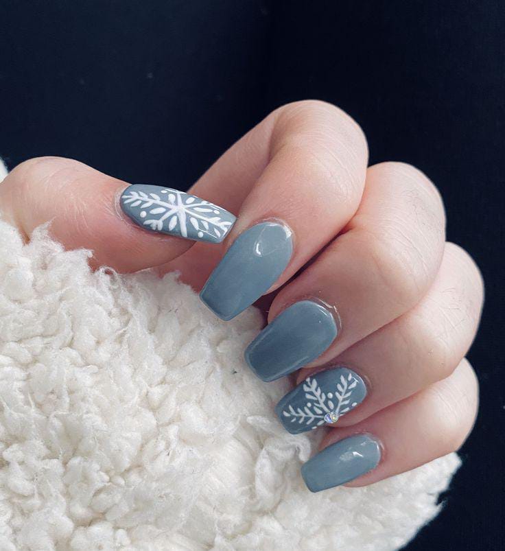 Muted blue nails paired with white snowflake accents create a calm, cozy, wintry style. It’s minimal but still clearly seasonal, perfect for chilly January days.