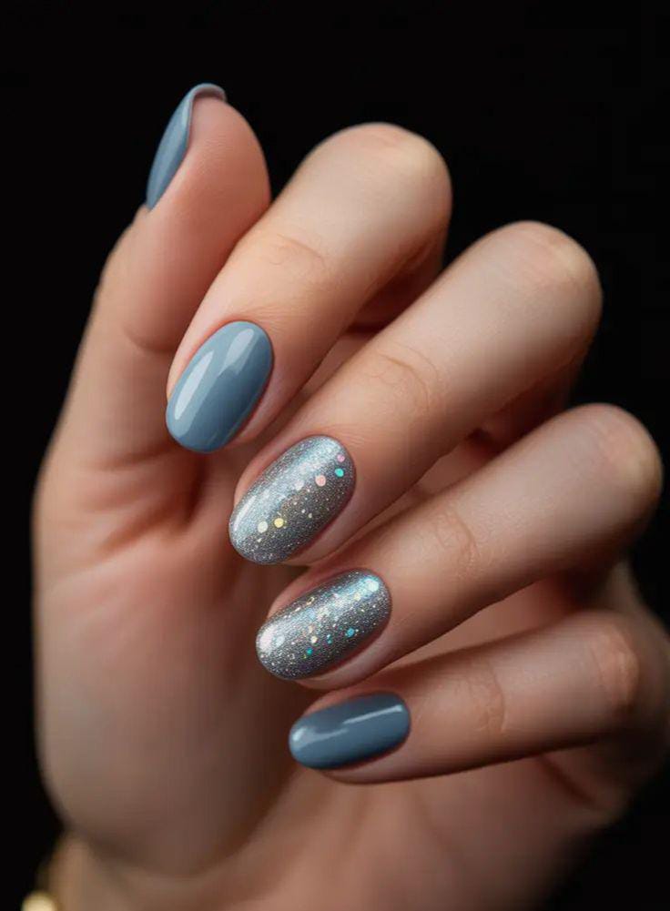 A mix of muted grey-blue nails paired with shimmering silver glitter accents gives this look a soft, elegant winter glow. It’s minimal yet eye-catching with its subtle January sparkle.