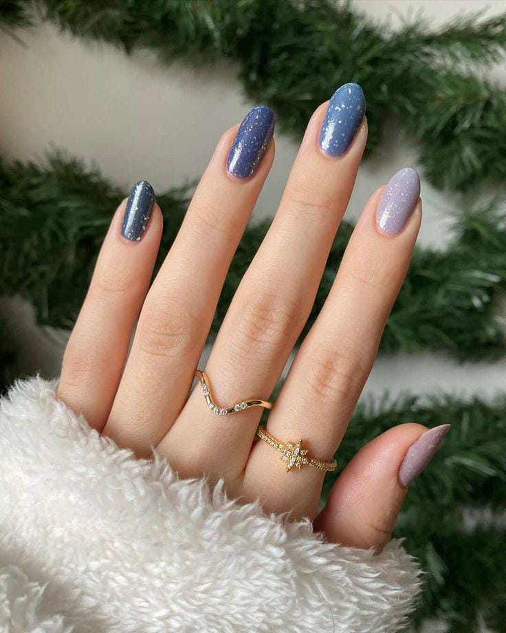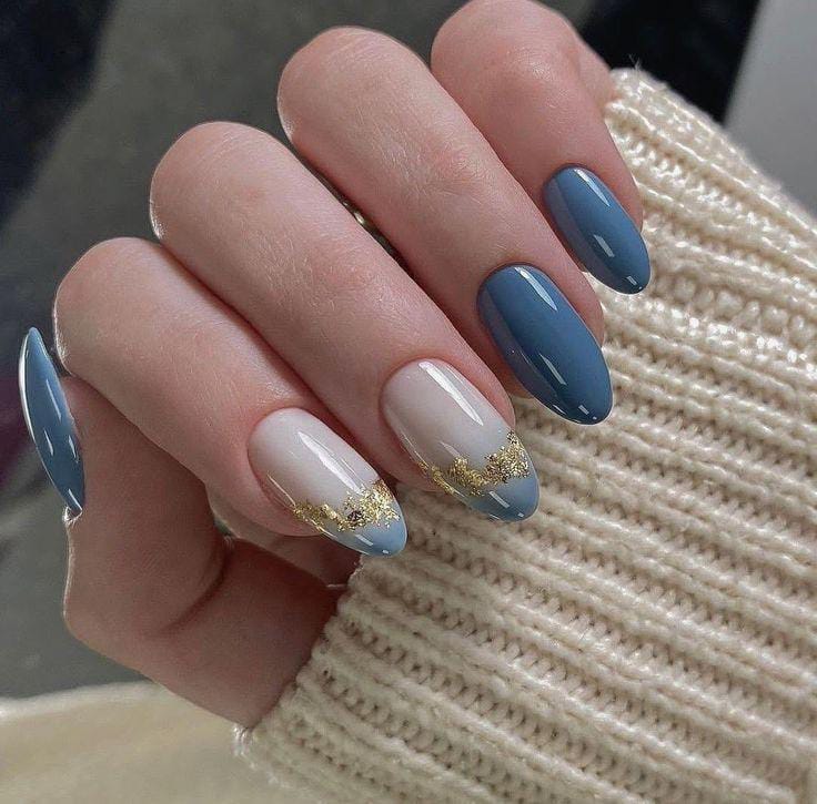 A mix of solid blue nails and soft nude nails topped with gold-trimmed blue tips creates an elegant and simple winter aesthetic. The gold detailing adds just enough shine for a polished January look.