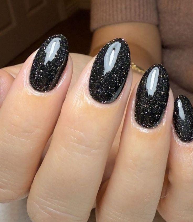 This design features glossy black nails filled with tiny glitter flecks, giving a sleek, night-sky effect. It’s bold yet simple, perfect for starting January with a touch of drama.