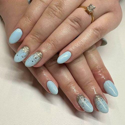 A light icy-blue base paired with gold glitter near the cuticles gives this look a soft yet festive touch. It’s fresh, simple, and ideal for a clean winter January feel.