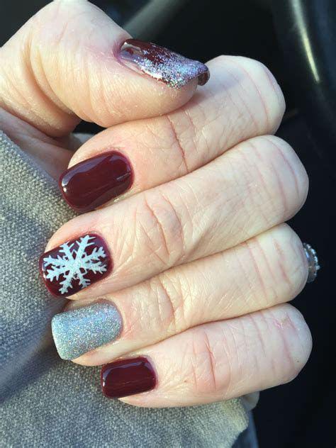 Deep burgundy nails are paired with shimmering silver accents and a single white snowflake, creating a minimal winter look. It’s understated but still seasonal and January charming.