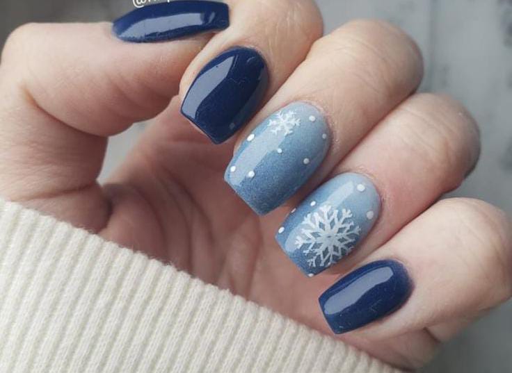 Deep navy nails pair with soft blue ombré snowflake accents, giving the set a calm, wintry nighttime feel. It’s simple but eye-catching, with just enough seasonal January detail.