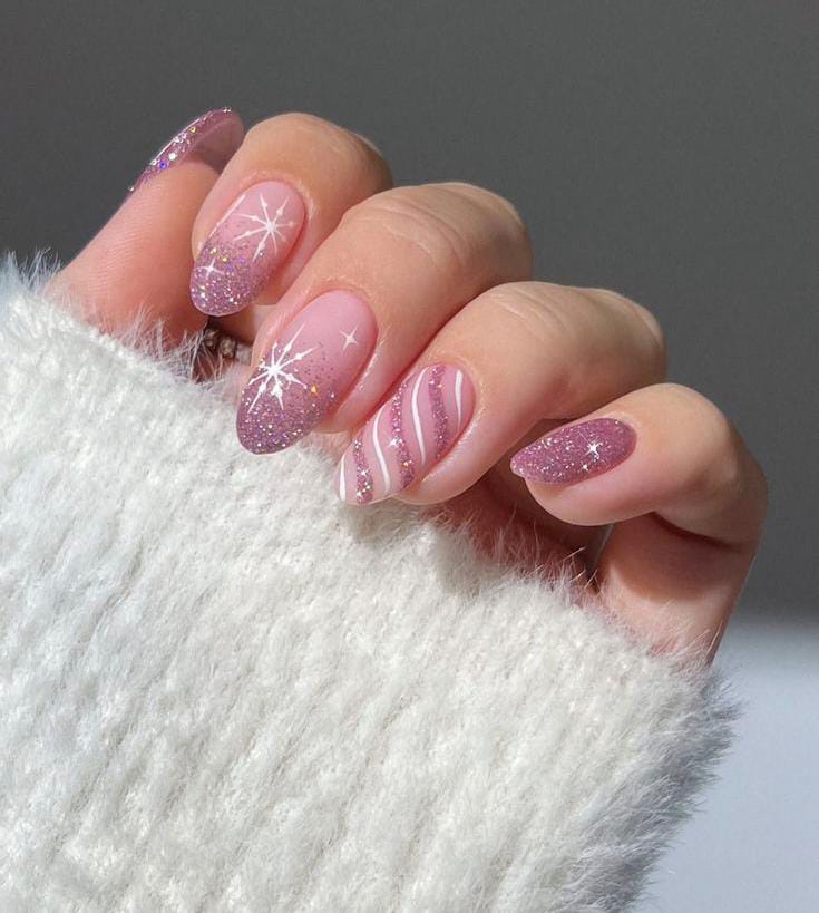 Light pink nails get a soft touch of glitter and subtle star-like accents, creating a dreamy, delicate winter January look. The gentle shimmer keeps it simple while still adding a festive glow.