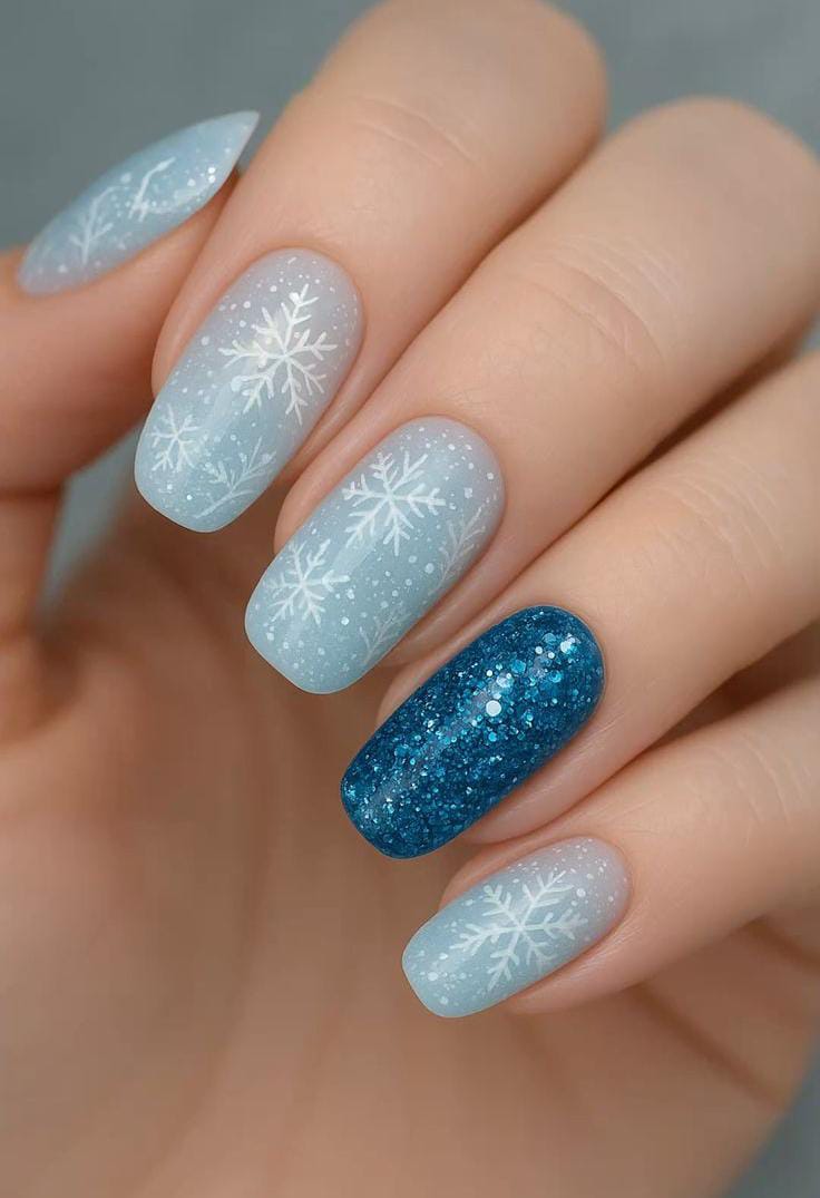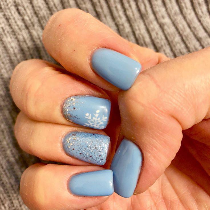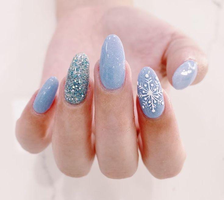Soft blue nails mixed with a glittery accent nail and a small snowflake motif create a simple, sparkly winter look. It’s understated but still adds a touch of seasonal January charm.