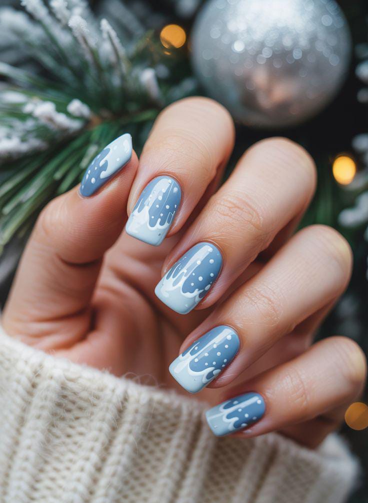 Light blue nails topped with white, icicle-like drips and delicate snowflakes capture a playful, frosty January aesthetic. The design is wintry and fun while still looking minimally polished.