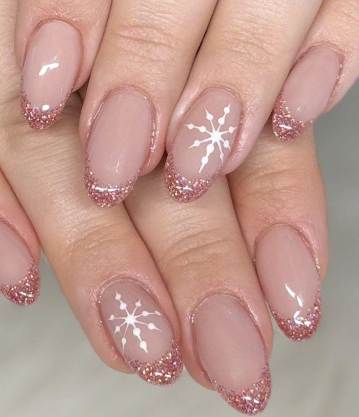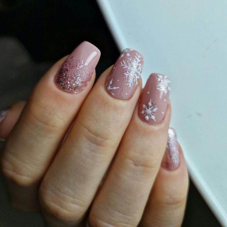 A warm rosy-nude base gets a wintery twist with soft white snowflakes and rosy glitter accents. The combination feels cozy and chic, offering a softer take on January winter nail art.