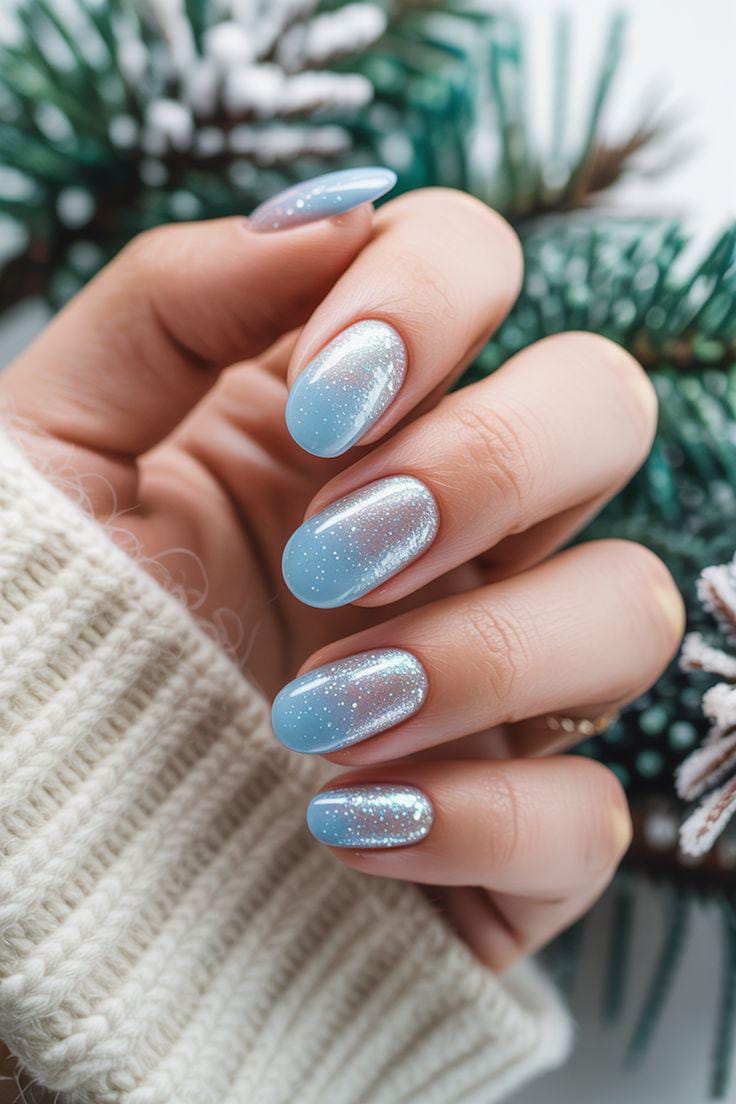 A smooth pale-blue gradient paired with a glossy, pearly shimmer creates a soft and simple January look. Light sparkles scattered across the nails give it a frosty, glowing finish.