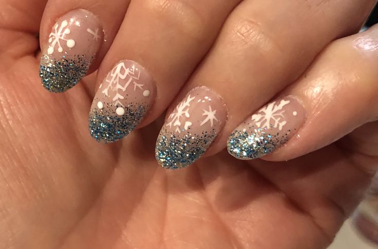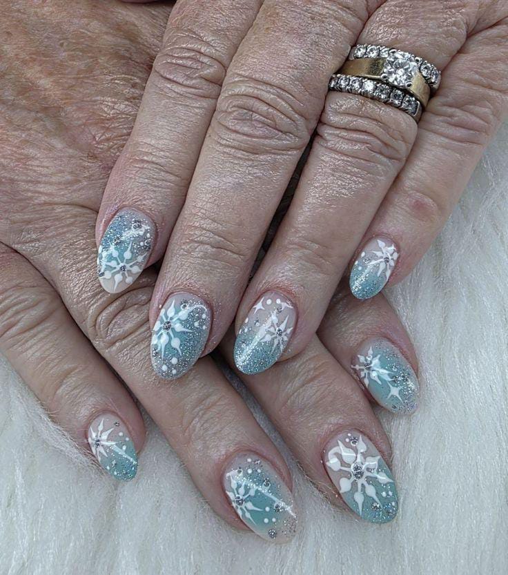 These nails mix cool blue tones with white snowflake-like bursts and a touch of glitter for a playful winter pattern. The design feels festive yet soft, perfect for a cozy January vibe.