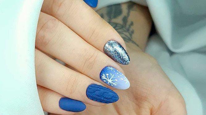 This set combines matte blues, silver glitter, and a soft snowflake accent for a simple winter mix. The textured knit-style nail adds a cozy sweater-weather touch that feels perfect for January.