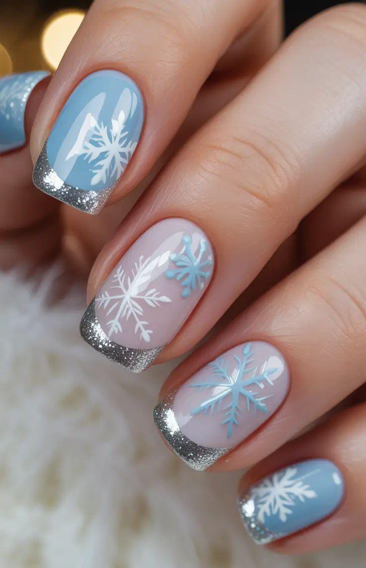 This design features soft blue and nude bases topped with delicate white and blue snowflakes, finished with sparkling silver French tips for a clean, winter-fresh look. It’s simple yet festive, giving off a crisp January vibe.