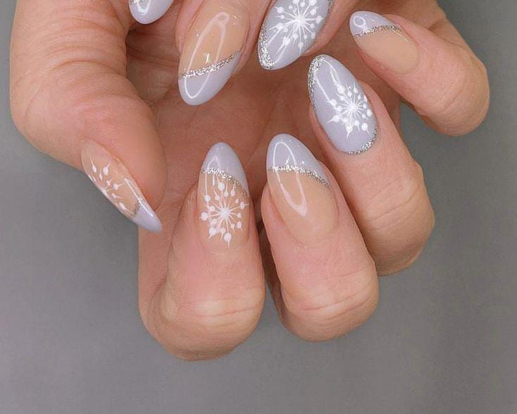 These nails combine pale grey tones with subtle silver lining and fine white snowflakes for a minimal, elegant January winter look. The overall style is soft, sleek, and quietly festive.