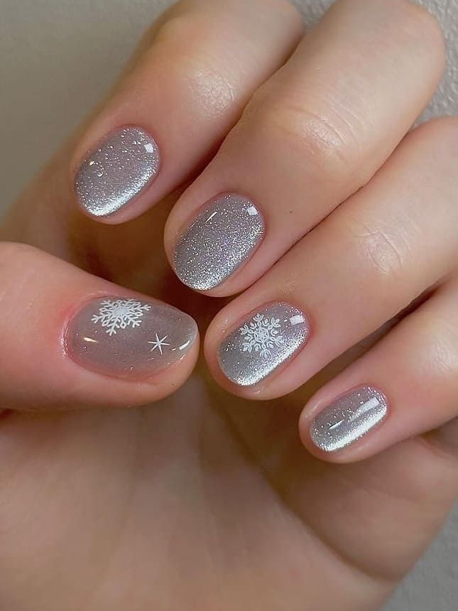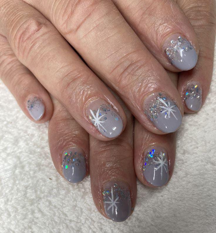 Short grey nails are dressed up with scattered holographic glitter and simple white star-like snowflakes, giving a relaxed but sparkly winter feel. It’s an easy, low-maintenance January design with a touch of shine.