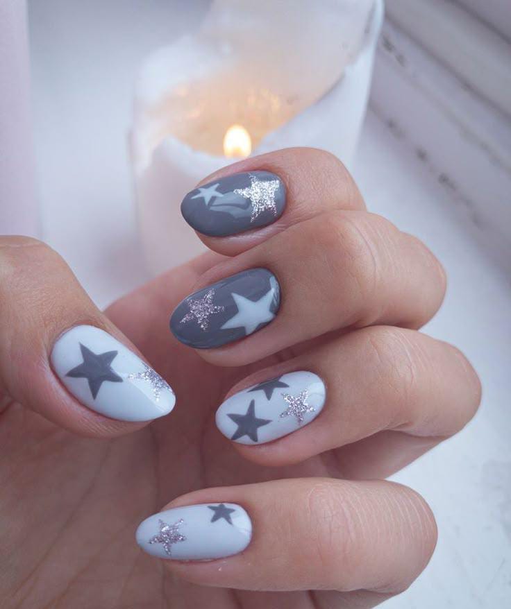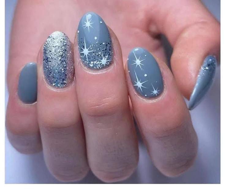 This design blends matte grey with silver glitter and delicate star patterns, creating a clean yet festive winter look. It’s simple, polished, and perfect for a fresh January start.