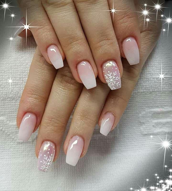 This design features a delicate pink-to-white ombre with a glossy finish, giving the nails a clean and wintry look, while simple white snowflakes add a soft seasonal January touch.
