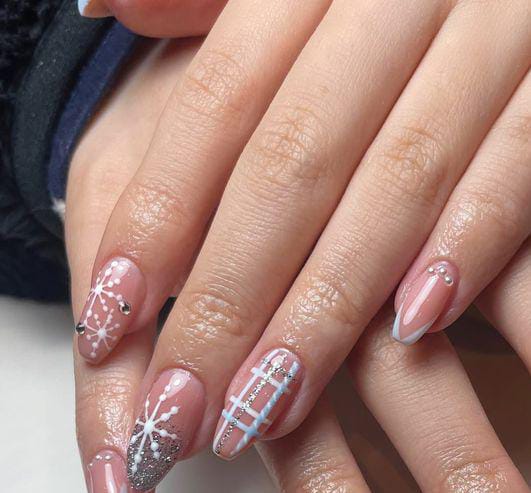 This set blends soft nude tones with white snowflakes, light blue plaid, and a hint of silver glitter, giving the nails a cozy, January winter-inspired feel without looking too busy.